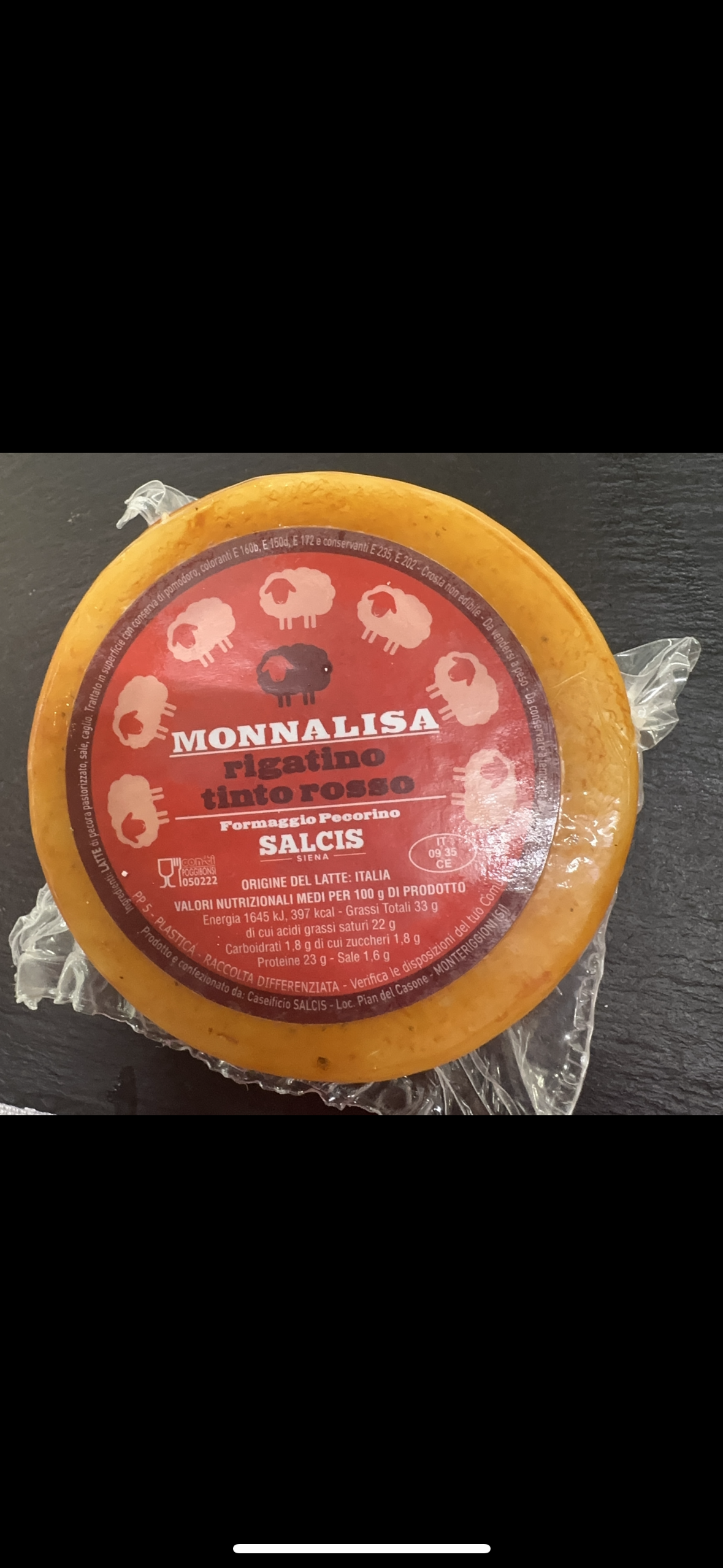 Ingredients: pasteurized sheep's milk, salt, rennet. Surface treated with tomato preserves, dyes E160b, E150d, E172 and preservatives E235, E202. Inedible rind