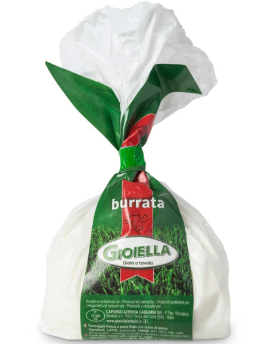 Burrata Gioiella: il cuore cremoso della Puglia. Un formaggio fresco a pasta filata dall’interno morbido e avvolgente, irresistibile al palato. Perfetta da gustare al naturale o come ingrediente di ricette creative, ad ogni assaggio si percepisce tutta la bontà del miglior latte italiano.