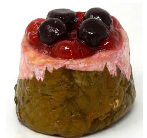 Ingredienti: Formaggio (LATTE pastorizzato, sale, fermenti lattici e di maturazione),Ciliegie candite (ciliegie 49%, sciroppo di glucosio-fruttosio, saccarosio, correttore di acidità: E330, conservante: E202, colorante: E127, conservante: E220 come residuo), Amarene ricoperte di cioccolato (Amarene candite 46% (ciliegie, sciroppo di glucosio-fruttosio, saccarosio, succo di amarena concentrato 5%, correttore di acidità: E330, colorante: E163, aromi, conservante: E220 come residuo), cioccolato fondente 53% (saccarosio, pasta di cacao, burro di cacao , emulsionante: lecitina di girasole, aroma), gomma arabica, agente di rivestimento: gomma lacca e olio vegetale di cocco). Avvolto in foglie di vite.