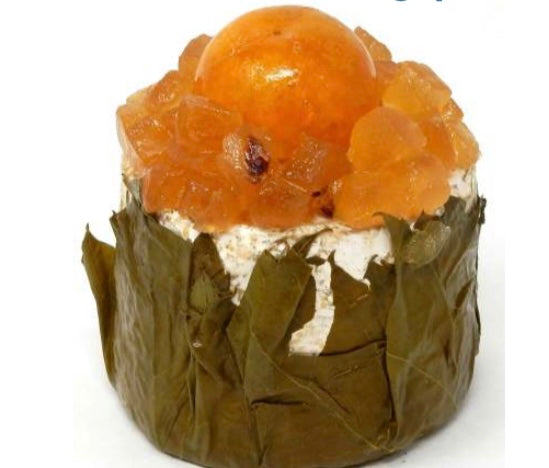 Viene affinato in foglie di vite e sulla faccia piana vengono disposti cubetti di pera e una clementina intera.