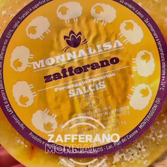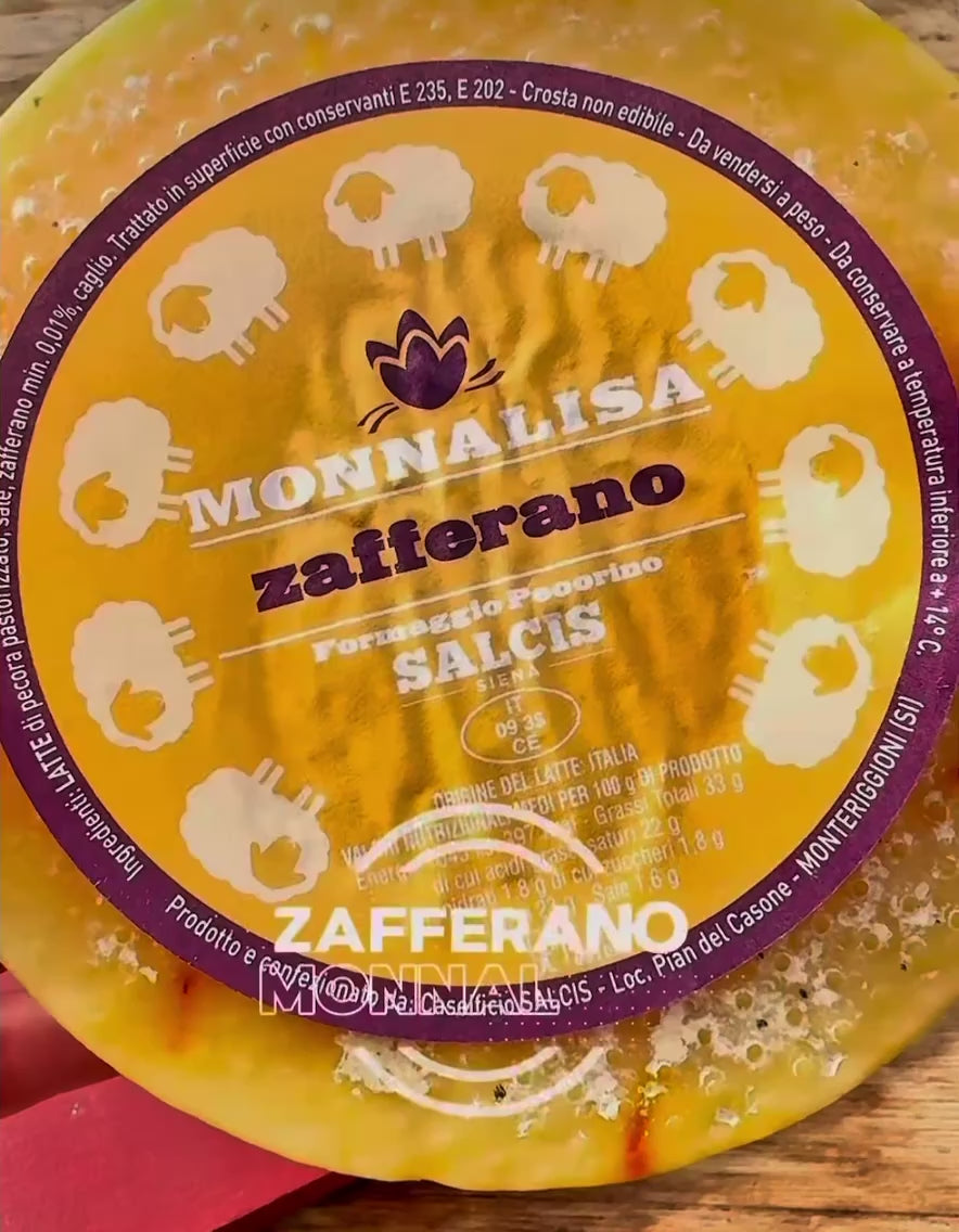 Ingredienti: latte di pecora pastorizzato, sale, zafferano (min. 0,01%), caglio. Trattato in superficie con conservanti: E235, E202. Crosta non edibile.